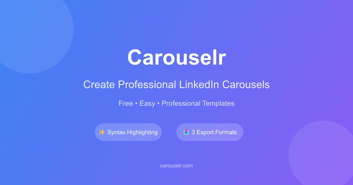 Design stunning, engagement-driving carousels without design skills. Professional templates, syntax-highlighted code blocks, and instant export to PDF, PNG, or HTML.